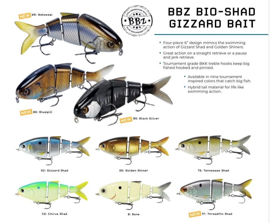 The FishLab BBZ Bio-Shad Gizzard Swimbait is a four-piece 6" swimbait that perfectly mimics the swimming action of both Gizzard Shad and Golden Shiners. These baits have great action on a straight retrieve or a pause and jerk retrieve. The BBZ Bio-Shad Gizzard will come standard with tournament-grade BKK treble hooks that keep big fish hooked and pinned so that you can get them to the boat or shore. Available in 9 tournament-inspired bass-catching colors such as Gizzard Shad, Golden Shiner, Tennessee Shad, Bone, and Citrus Shad. These baits also feature a hybrid tail material for more of lifelike swimming action.