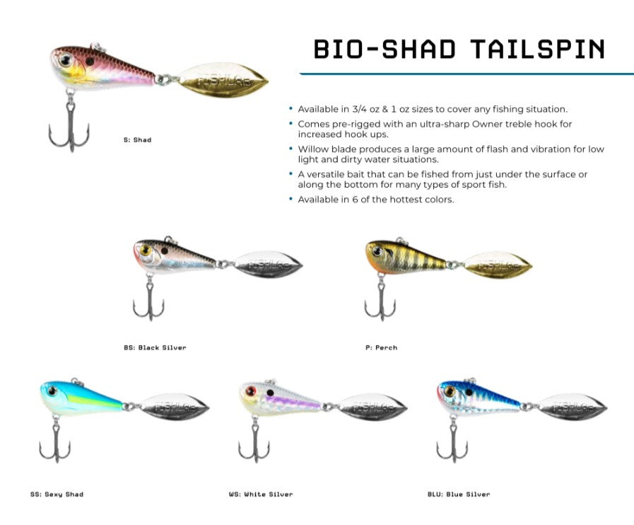 The FishLab Bio-Shad Tailspin will be available in two sizes, 1 ¾” – ¾oz and 2” – 1oz sizes and will come in the most popular gamefish colors such as Black/Silver, Perch, Shad, Sexy Shad, White Silver, and Blue Silver. The Bio-Shad Tailspin comes pre-rigged with an ultra-sharp Owner treble hook as well as a willow blade that produces a large amount of flash and vibration for low light and dirty water conditions.