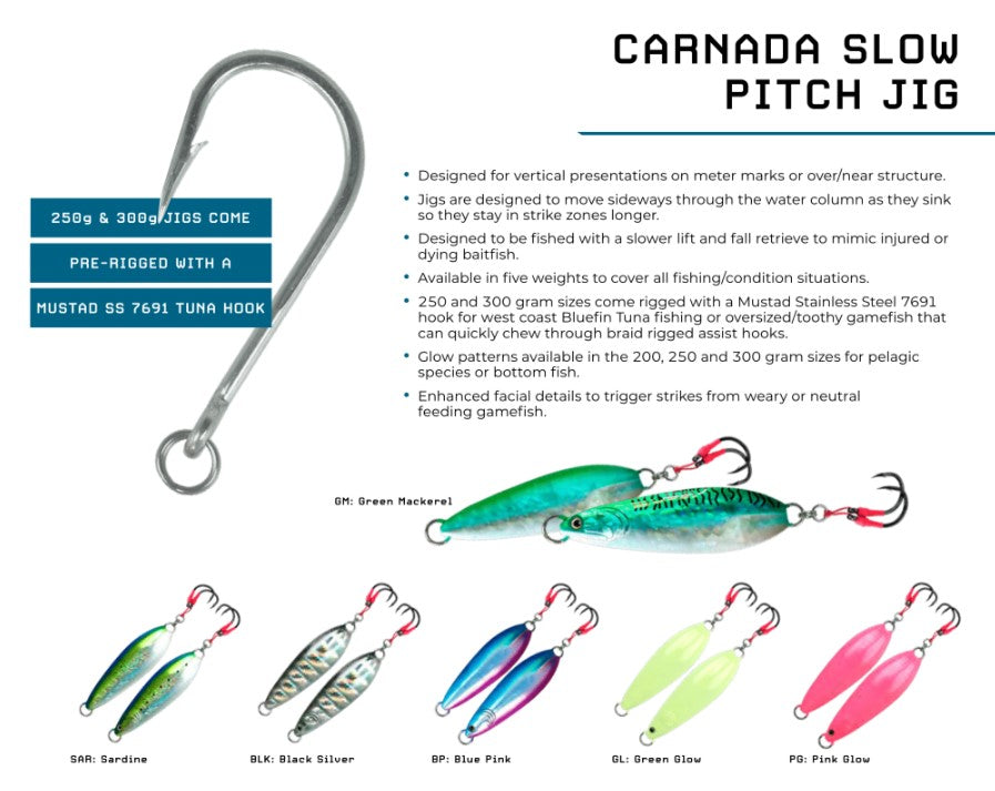The Carnada Slow Pitch Jig is designed for vertical presentation on meter marks or over and near structure. These jigs are designed to move sideways through the water column as they sink so they stay in the strike zone longer. Designed to be fished with a slower lift and fall retrieve to mimic injured or dying baitfish. Available in five lengths and weights to cover all fishing conditions and situations. 4“ 100 gram, 4½" 150 gram, 5“ 200 gram, 5 ¼“ 250 gram and massive 5 ½“ 300 gram sizes. The 200, 250 and 300 gram sizes are available in glow patterns for pelagic species or bottom fish. The 250 and 300 gram sizes come rigged with a Mustad Stainless Steel 7691 hook for west coast Bluefin Tuna fishing or oversized and toothy gamefish that can quickly chew through braid rigged assist hooks. Also available in seven saltwater forage matching patterns.