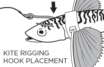 For Kite Rigging, place hook behind eyes of baitfish. For Fly Line Rigging, place hook on the nose.