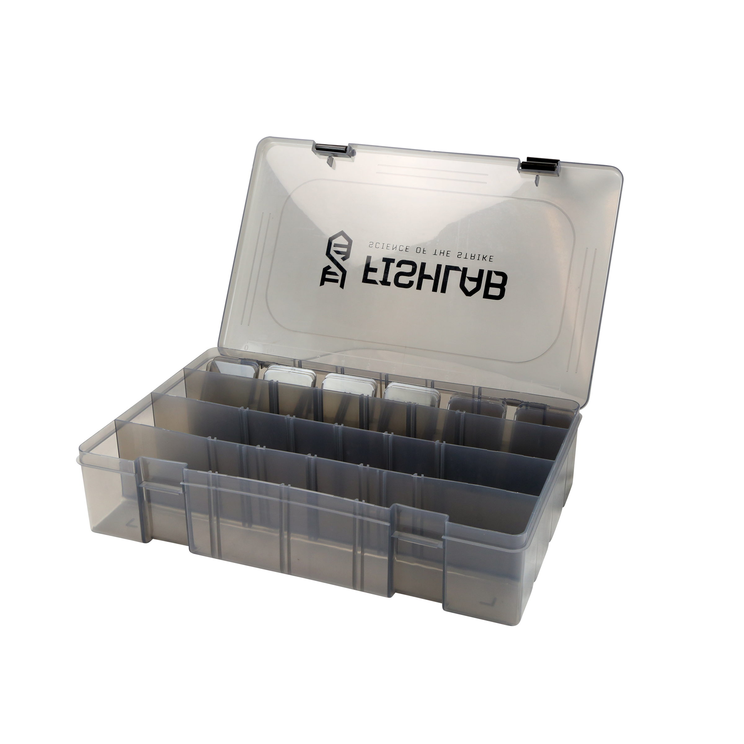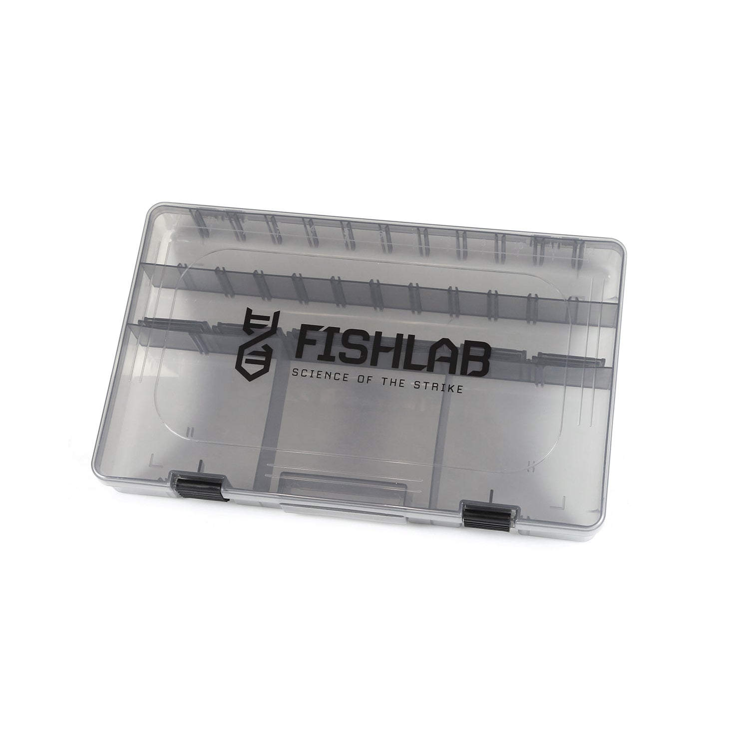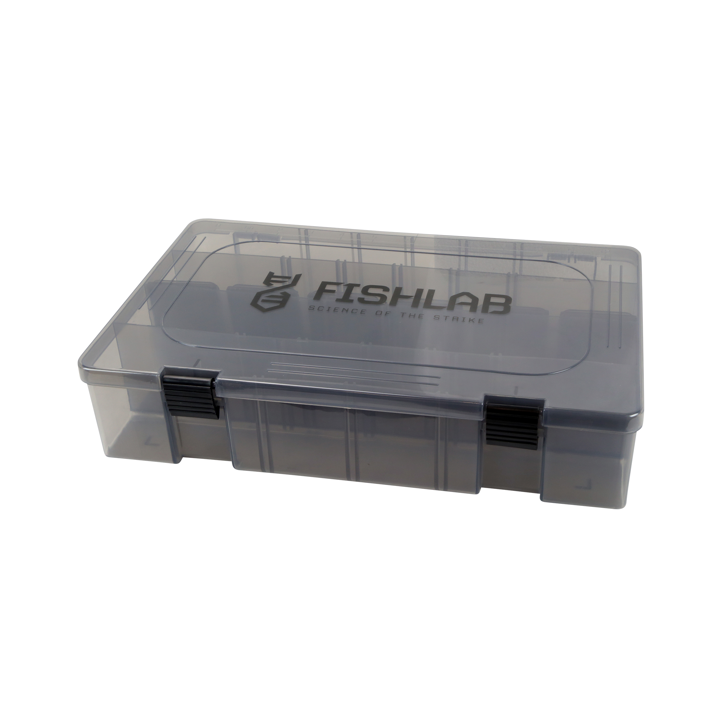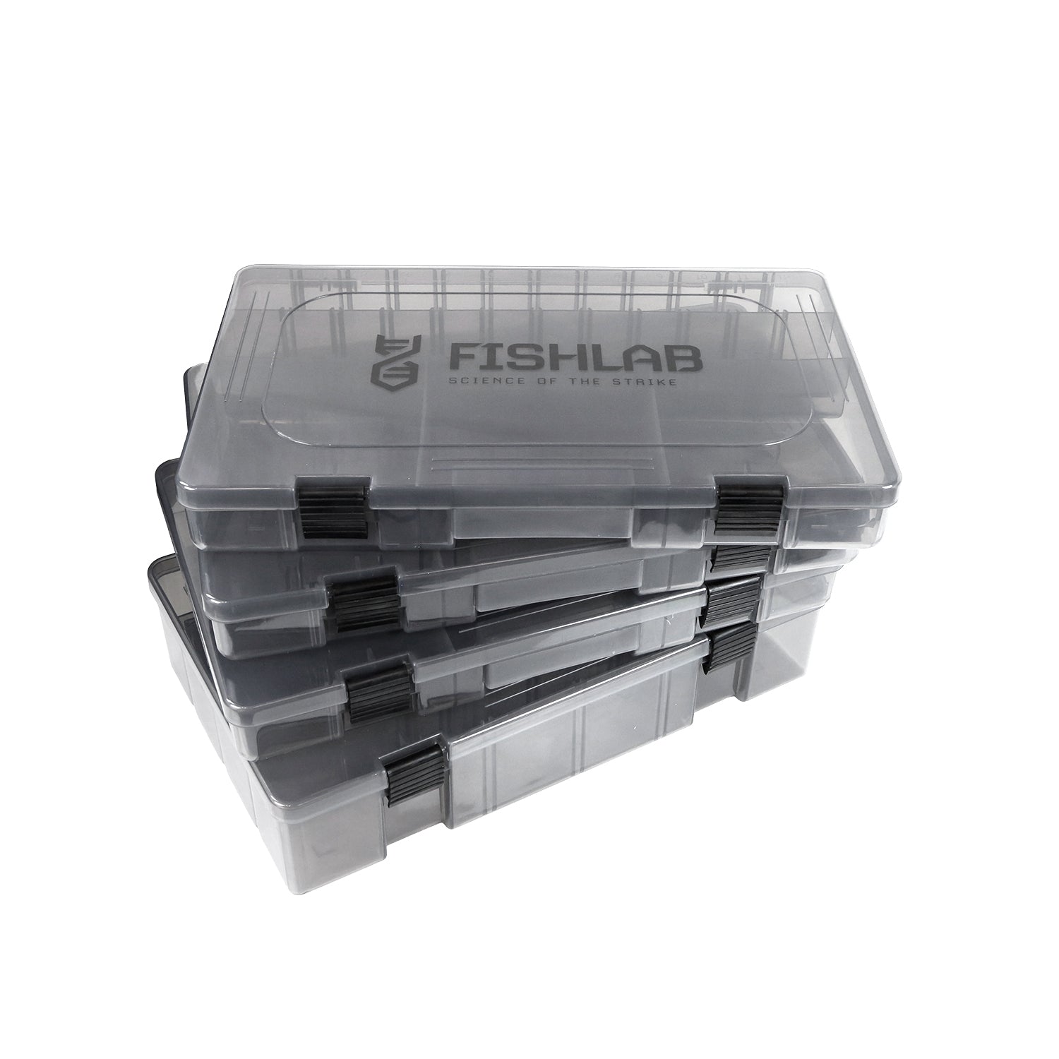 Individual Smoke Tinted FishLab Tackle Boxes with Adjustable Bin Storage and Latches.  These tackle boxes are perfect to store all of your FishLab baits and other baits as well. With moveable dividers, you can customize your boxes to your own needs.
